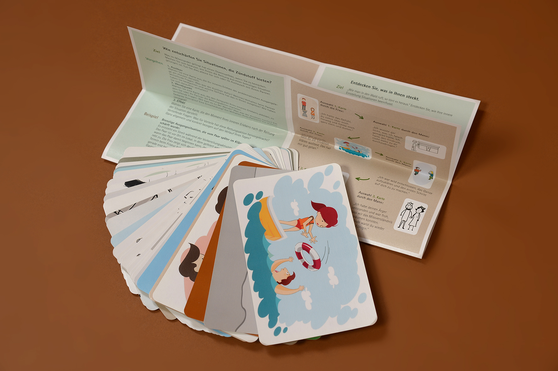 Ist der Partner erst einmal verletzt oder sind die Fronten verhärtet, fällt es schwer, wieder ins Gespräch zu kommen. Vorwürfe und Rechtfertigungen bestimmen dann oft das Gesprächsklima, die Diskussion dreht sich im Kreis. Außerdem findet nicht jeder Mensch immer die passenden Worte für seine Gefühle. „Ich habe lange nach einer Brücke gesucht, die es Paaren erleichtert, ihre Beziehungsthemen konstruktiv zu klären“, so Petra Nordhaus. Verhalten ist Einstellungssache. Daher gilt es, der inneren Einstellung auf die Spur zu kommen. In festgefahrenen Situationen funktionieren Bilder sehr gut als Übersetzer. „In die Ecke drängen“, „mit dem Holzhammer beibringen“ oder „auf Augenhöhe kommunizieren“ - negative wie wertschätzende Verhaltensweisen bringen die 32 illustrierten Karten schnell erkennbar auf den Punkt. Die weiterführenden Fragen der anschaulichen Anleitung rufen den Kartennutzern ihre innere Einstellungen ins Bewusstsein, sensibilisieren für neue Verhaltensweisen und geben konkrete Hilfestellung für ihre Umsetzung im Alltag. Verständnis und Annäherung in der Beziehung werden spielerisch gefördert. Das Kartenset kann von Paaren eigenständig genutzt oder als unterstützendes Instrument in der Paarberatung eingesetzt werden. In anderthalb Jahren realisierte es Petra Nordhaus parallel zu ihrer Beratungstätigkeit. Dabei wurden Prototypen des Kartensets sowie sämtliche Bildmotive in der Beratungspraxis ausgiebig erprobt. Um möglichst viele Menschen anzusprechen, setzten mehrere Illustratoren die Bildmotive in verschiedenen Gestaltungsstilen um. „Vielen Klienten ist beim spielerischen Umgang mit ihren Problemen schon mehr als ein Licht aufgegangen“, freut sich Petra Nordhaus. Diese „Hilfe zur Selbsthilfe“ gibt es jetzt auch für Zuhause. Über neue Wege, Paare mit ihrem Kartenspiel intensiv vertraut zu machen, denkt die 42-Jährige aktuell nach.